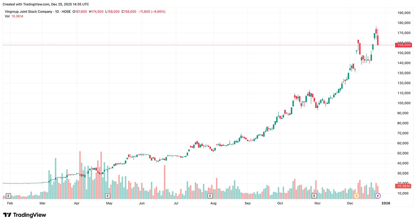 Bạn có thể thấy VIC đi từ mốc gần 30K từ tháng 03/2025 và lên 169K vào hôm qua (24/12/2025). Theo tui nhận định thì năm qua có rất nhiều nhà đầu tư phải nói là x4, x5 tài khoản là bình thường. Phải nói là tui cũng ham lắm, nhưng chiến thuật đầu tư của tui không cho phép tui đầu tư vào những mã như VIC.