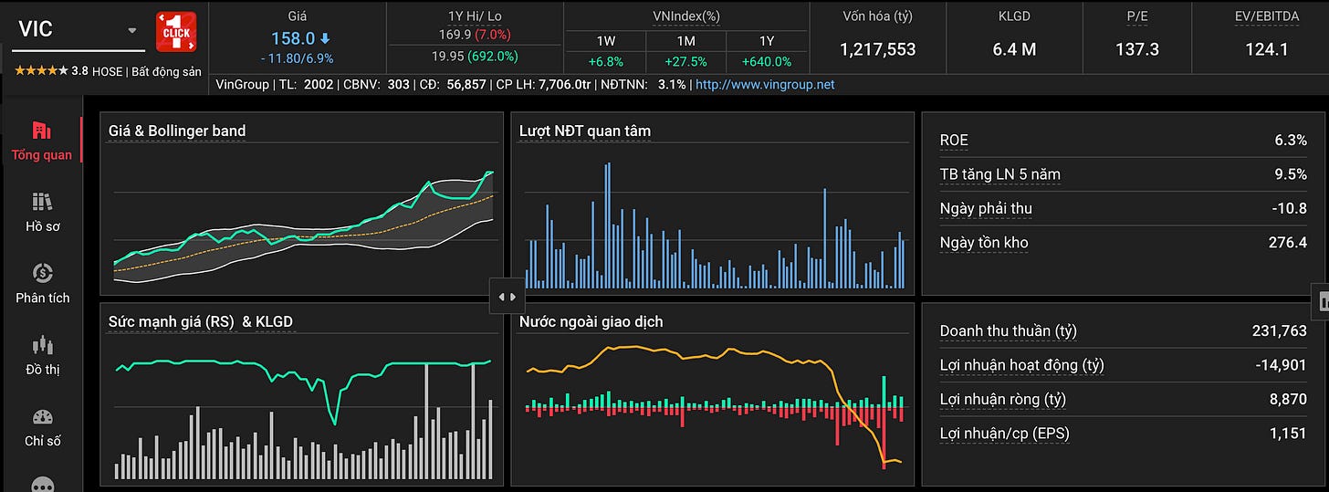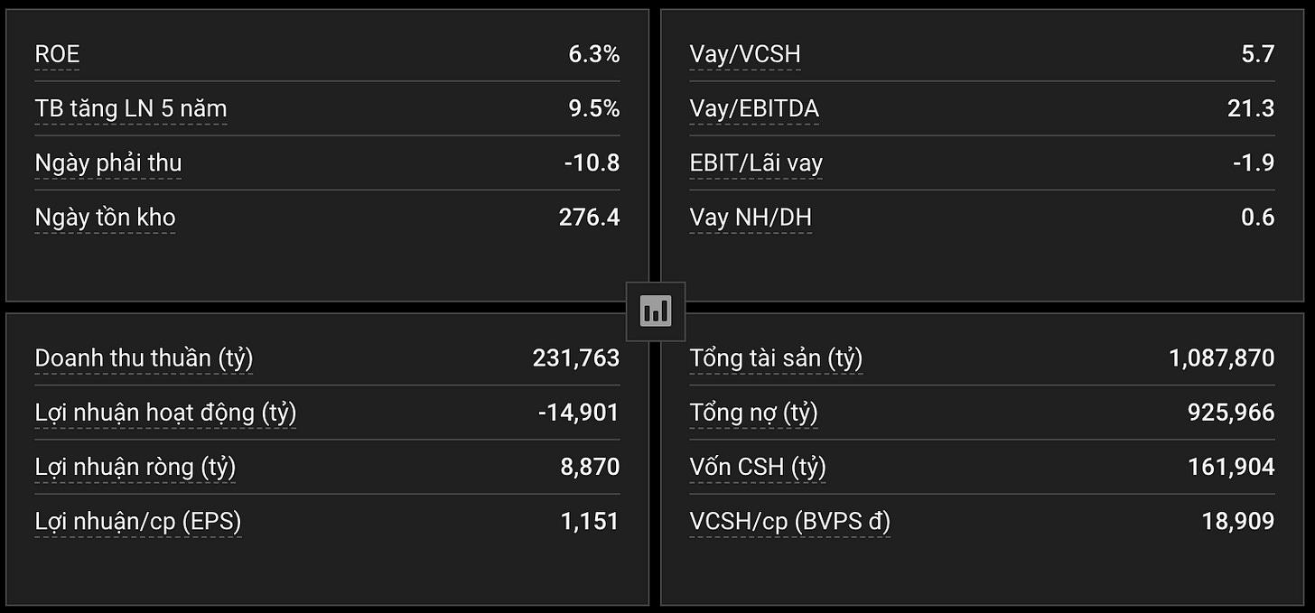 Theo số liệu từ TCBS, tui có thể thấy là VIC đang có tổng nợ khoảng 925 ngàn tỉ trong khi doanh thu thuần là 231 ngàn tỉ. Tức là số nợ đang gấp khoảng 4 lần doanh thu thuần. Nếu để ý thêm thì thậm chí Lợi nhuận hoạt động đang âm 14K tỉ.