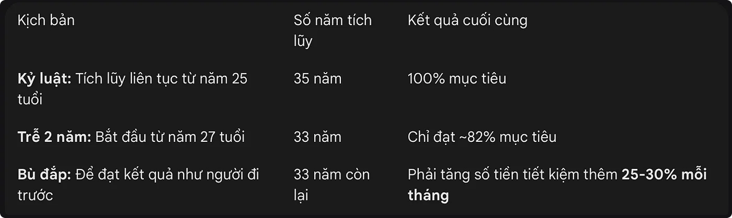 Trong đó n (thời gian) là số mũ. Khi bạn dừng lại, bạn không chỉ mất số tiền gốc mà còn mất toàn bộ phần lãi đáng lẽ được sinh ra từ số tiền đó cho đến cuối đời.