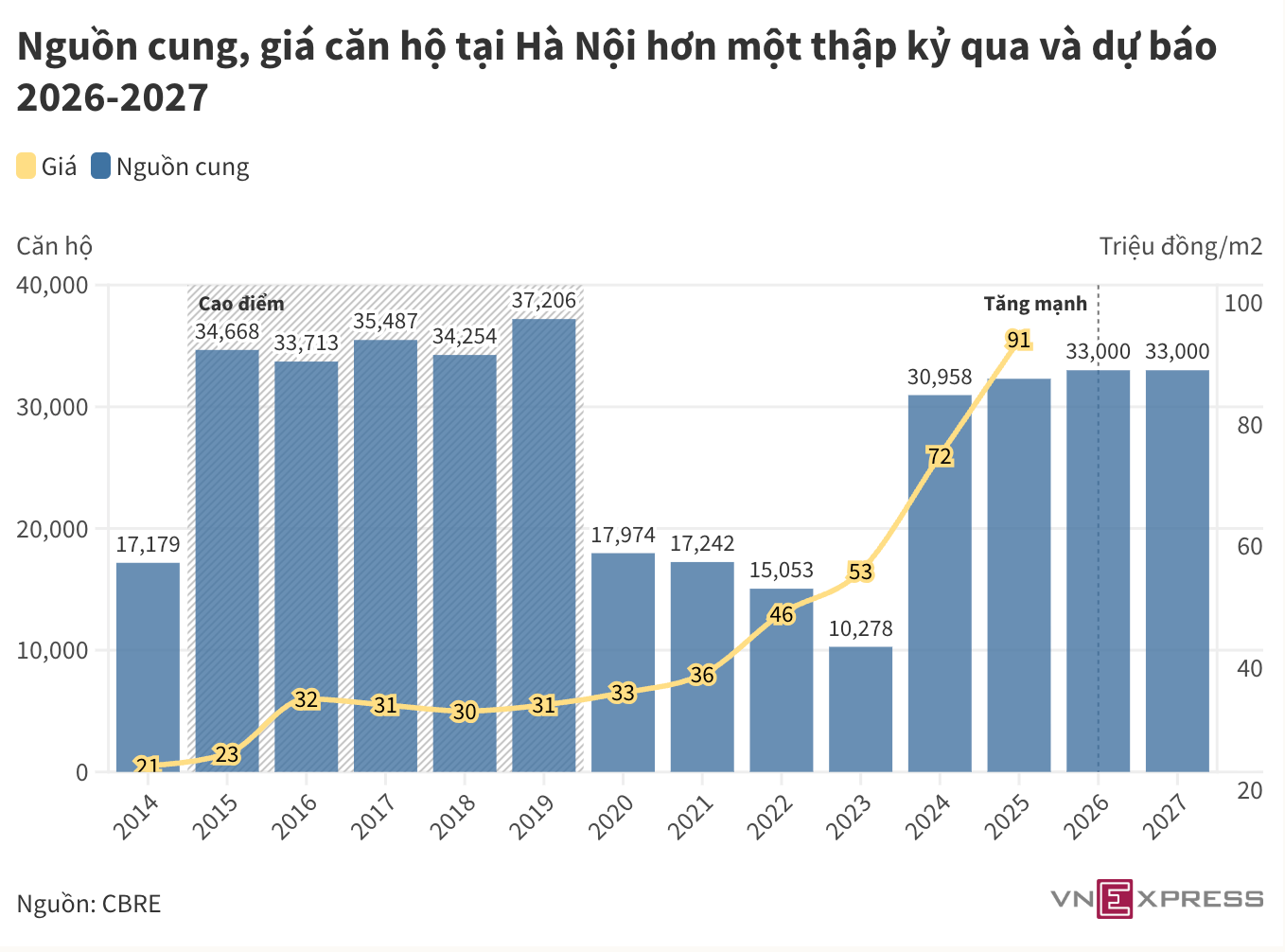 Từ năm 2025–2027, Hà Nội và vùng ven dự kiến đón 33.000–35.000 căn hộ mới mỗi năm, chủ yếu thuộc phân khúc cao cấp, hạng sang.