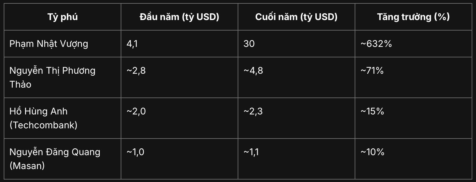 Tui lôi thêm mấy ông tỷ phú Việt trong ngân hàng, công nghệ ra so sánh, xem tăng trưởng tài sản từ đầu năm 2025 đến giờ: