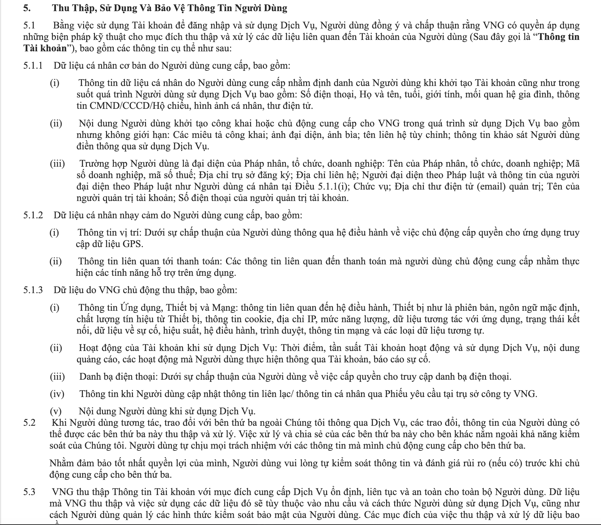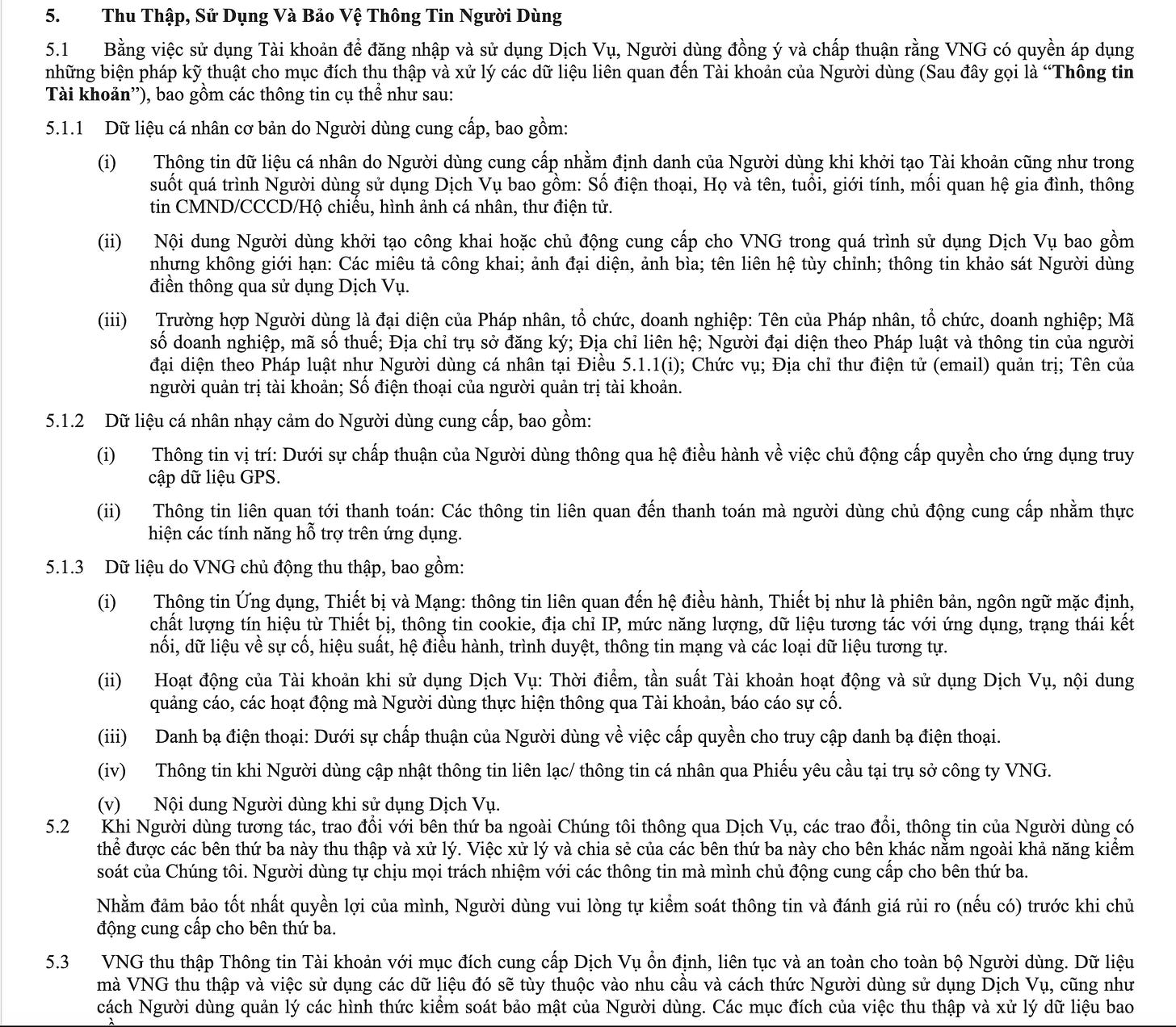 Theo tui điều này tiềm ẩn rủi ro vì không chỉ là công ty con và công ty thành viên, ngay cả công ty liên kết cũng có khả năng truy cập dữ liệu. Nghĩa là giả sử hiện tại thì không sao nhưng sau này nếu VNG liên kết với một công ty bên Trung Quốc, Mỹ hay một đất nước nào khác ngoài Việt Nam thì họ cũng mặc định có khả năng truy cập dữ liệu sao? Dĩ nhiên với giả định là VNG cho phép họ làm điều đó. Hay nói cách khác là sau này không cần phải hỏi lại người dùng nữa cứ thế mà triển khai.