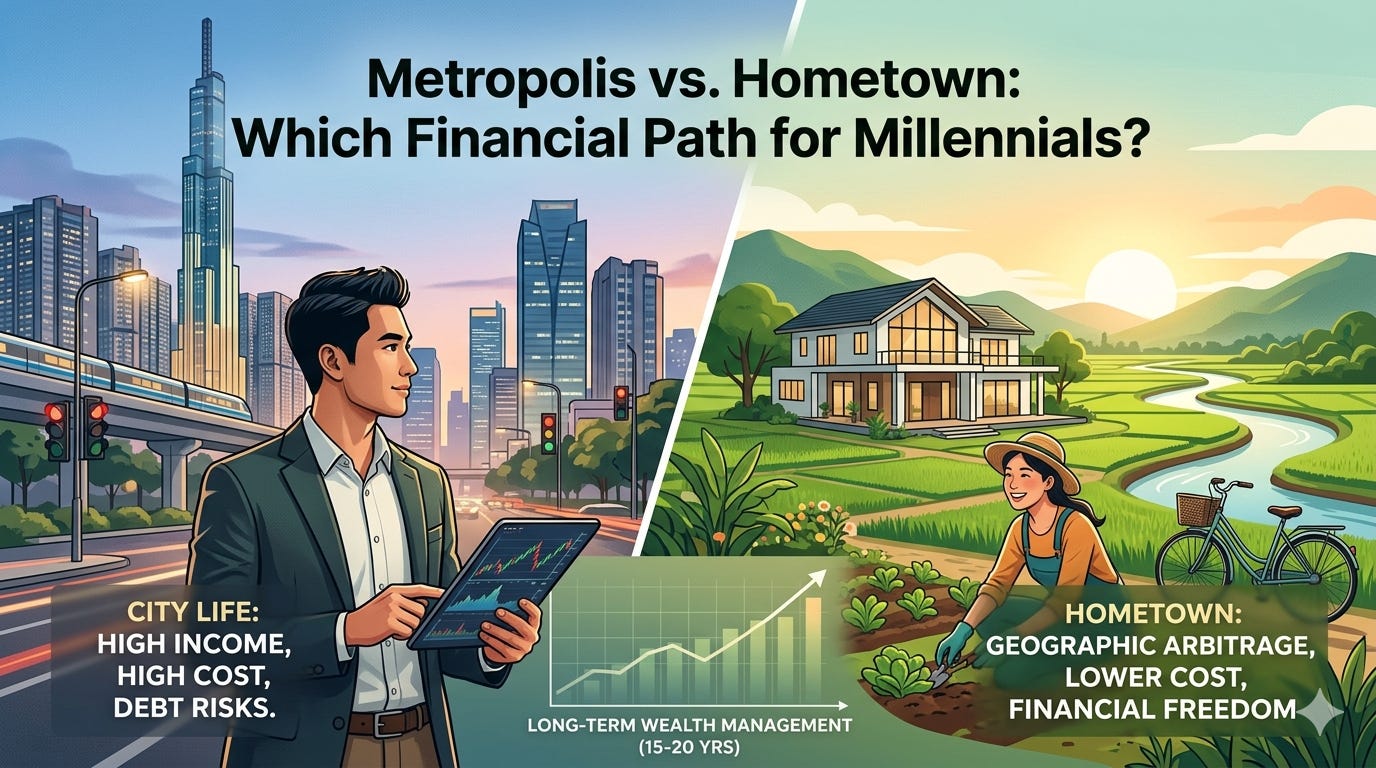Cậu ấy hỏi tôi một câu mà tôi tin là rất nhiều người trong chúng ta, những người thuộc thế hệ Millennial (30–45 tuổi) đang làm trong ngành Tech hoặc tài chính, đều từng thoáng qua trong đầu: “Liệu có nên bỏ phố về quê (Relocate) để tìm kiếm một sự giải thoát tài chính thực sự, hay tiếp tục bám trụ ở đô thị (Metropolis) để giữ lấy những tiện ích xa hoa?”